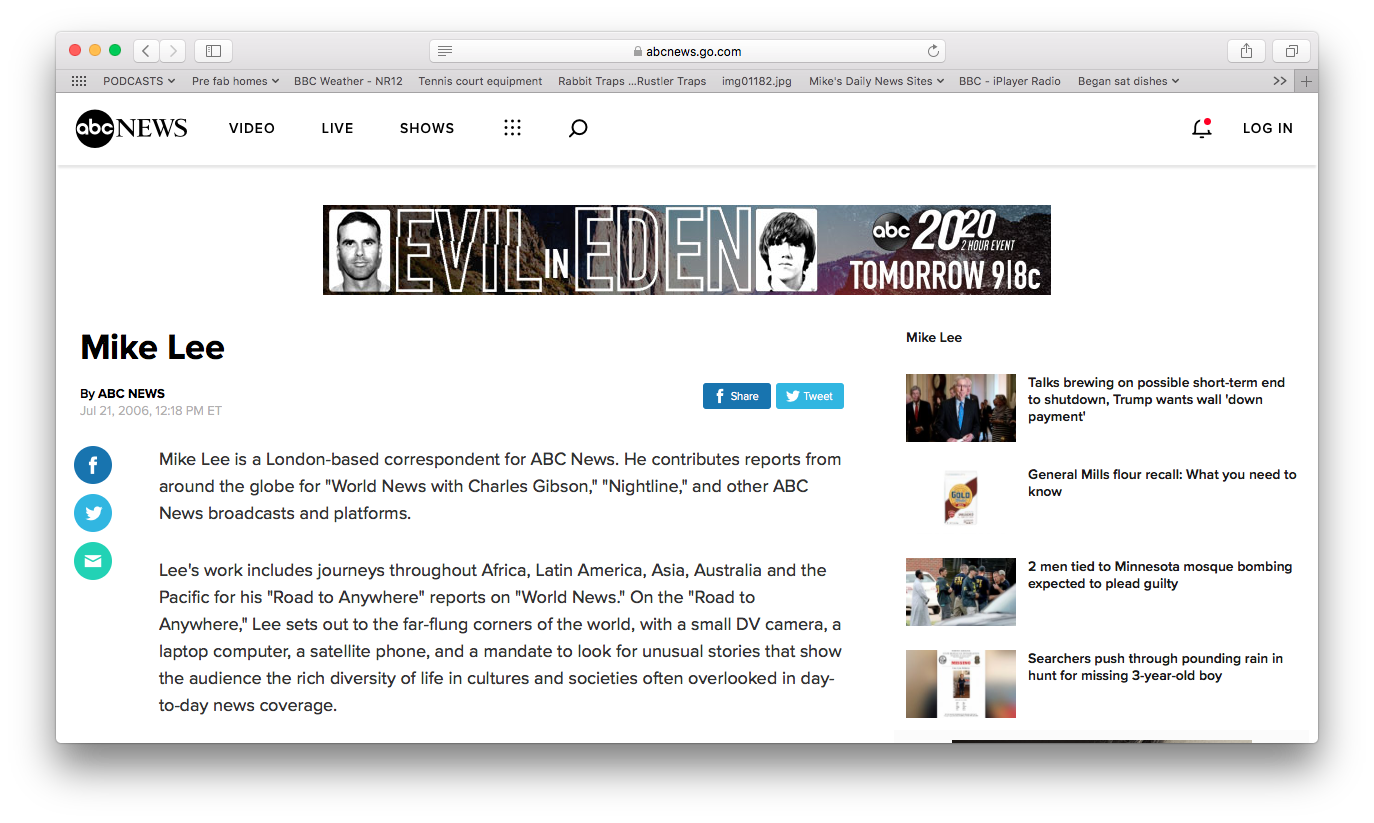 Lee’s work includes journeys throughout Africa, Latin America, Asia, Australia and the Pacific for his “Road to Anywhere” reports on “World News.” On the “Road to Anywhere,” Lee sets out to the far-flung corners of the world, with a small DV camera, a laptop computer, a satellite phone, and a mandate to look for unusual stories that show the audience the rich diversity of life in cultures and societies often overlooked in day-to-day news coverage.